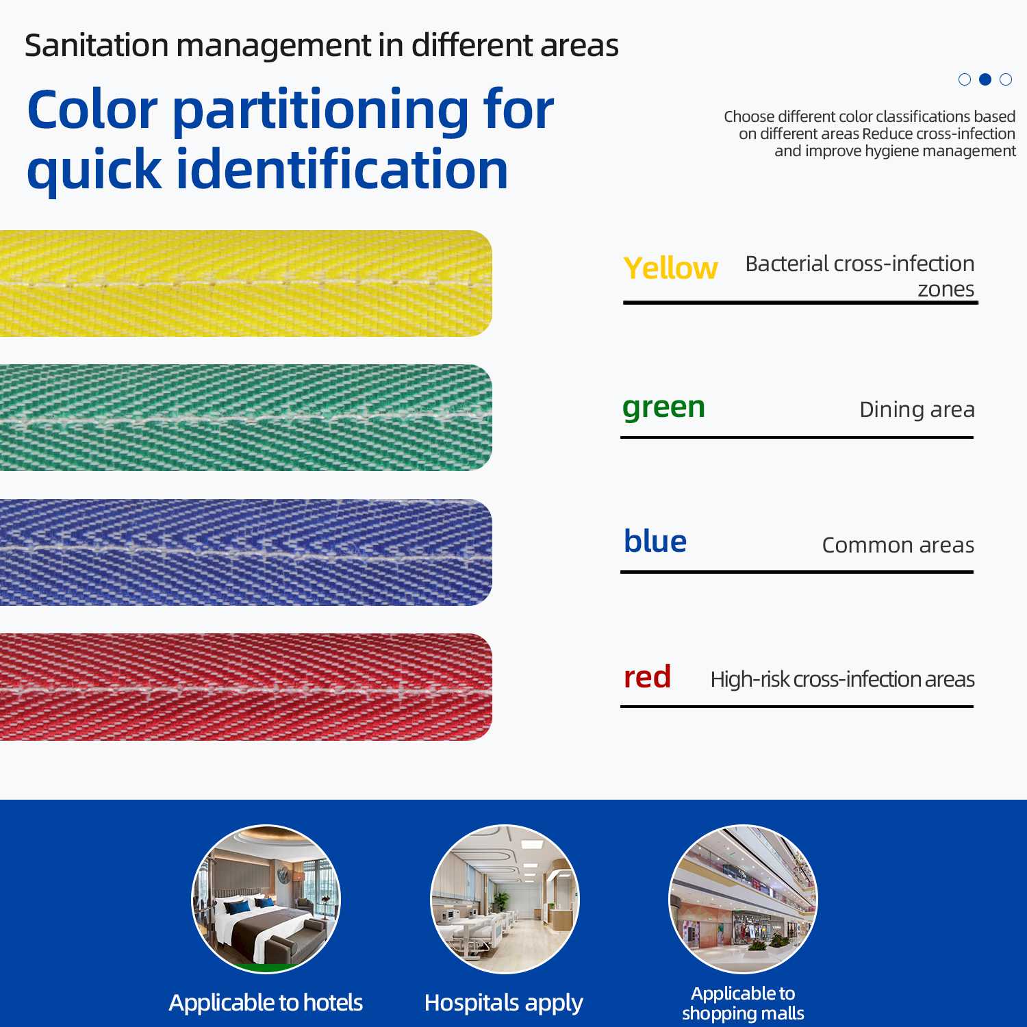 الحل: أربعة ألوان مميزة تتيح التعرف السريع على المنطقة لمنع التلوث المتبادل. تضمن مادة الغزل القطنية الممتازة التنظيف السريع والنظافة المستدامة للأرضيات.